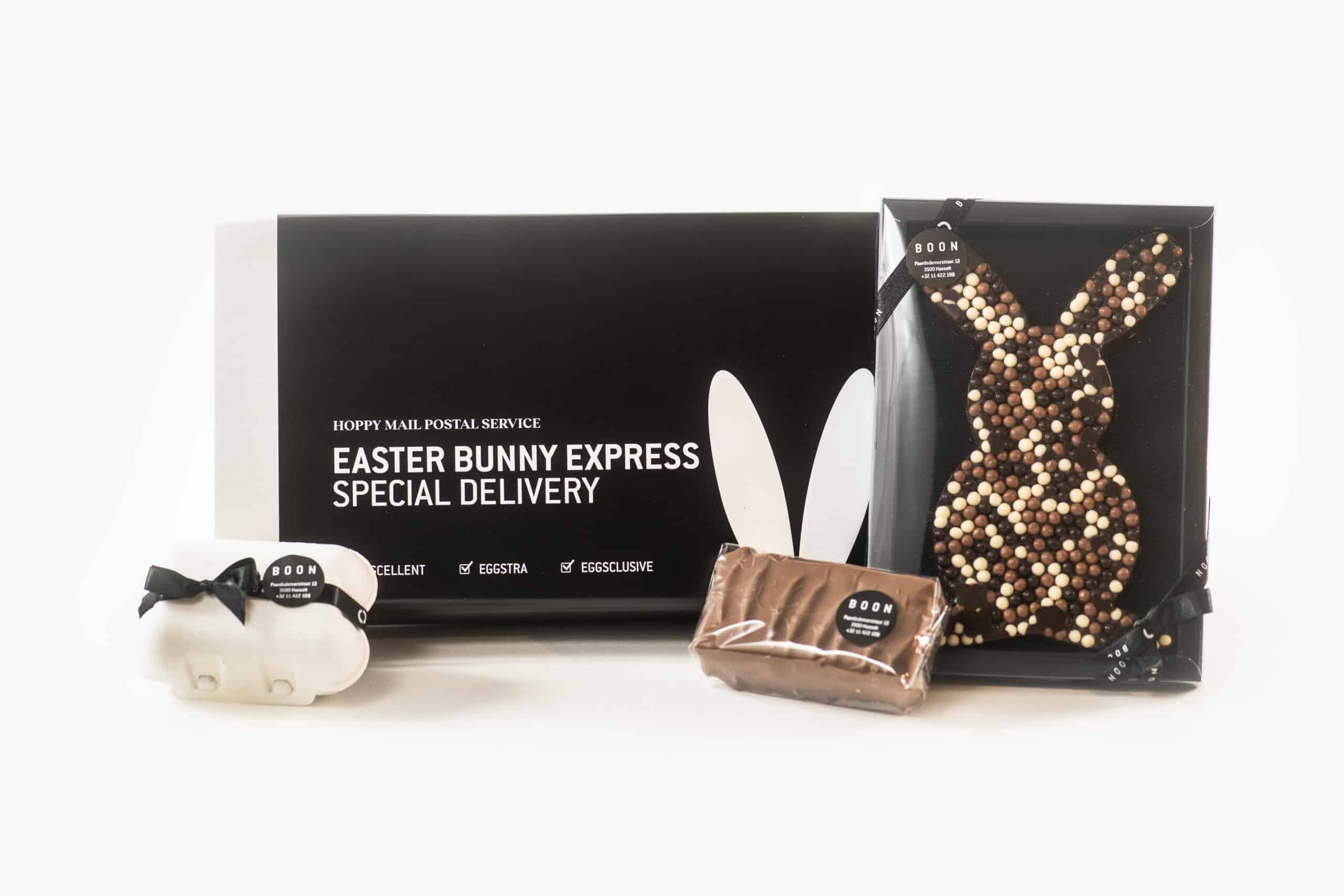 Ons paashaas pakket bestaat uit een paashaas met een topping crispy pearls, een doosje met een assortiment van 6 praliné eitjes en een powerbar.