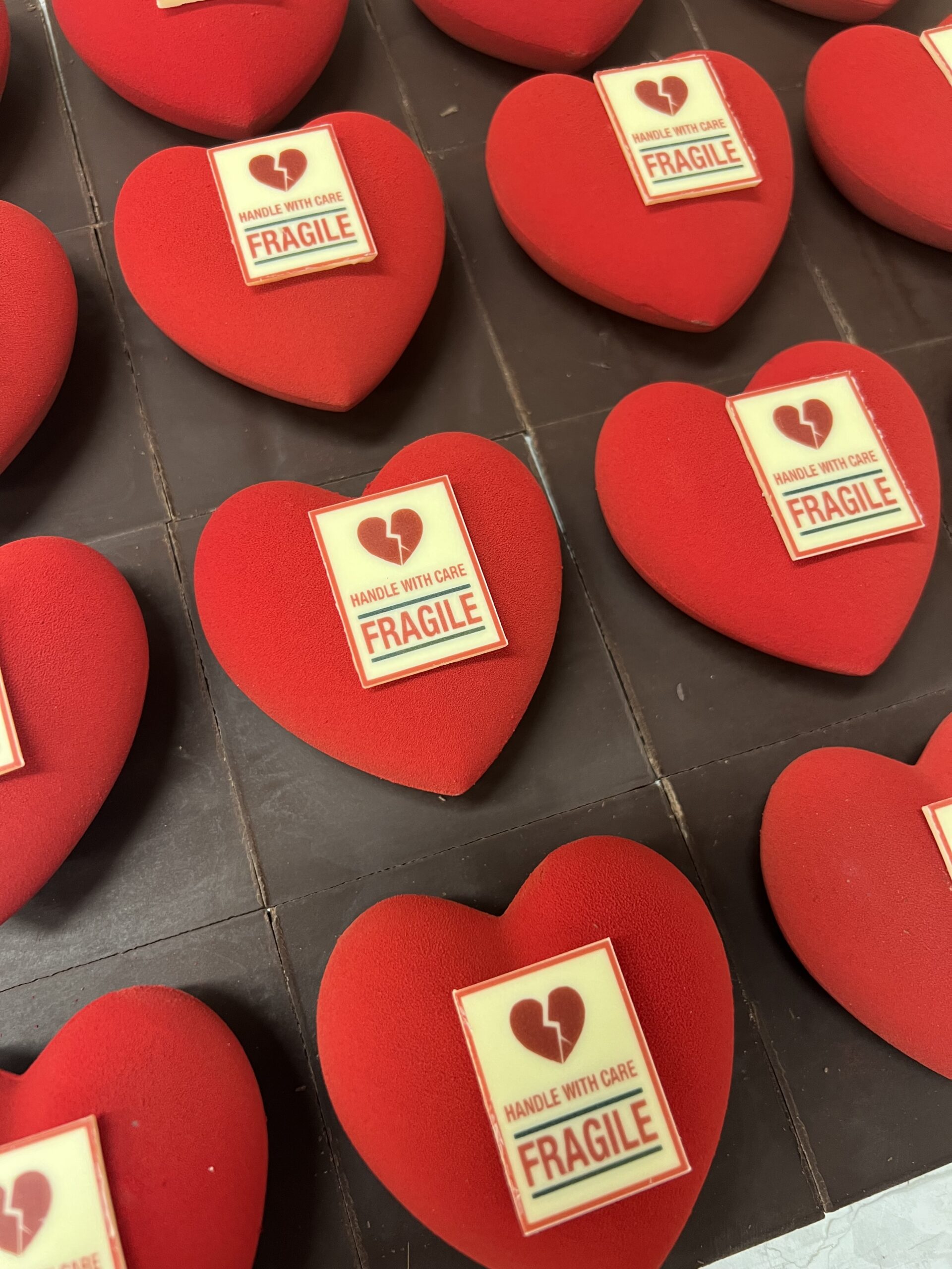 Fluweel hartje van melkchocolade, afgewerkt met een rood fluweellaagje en geplaatst op een bodem van donkere chocolade. Bovenop een wit schijfje met de tekst “Handle with care, Fragile”. Het hartje is hol en niet gevuld.