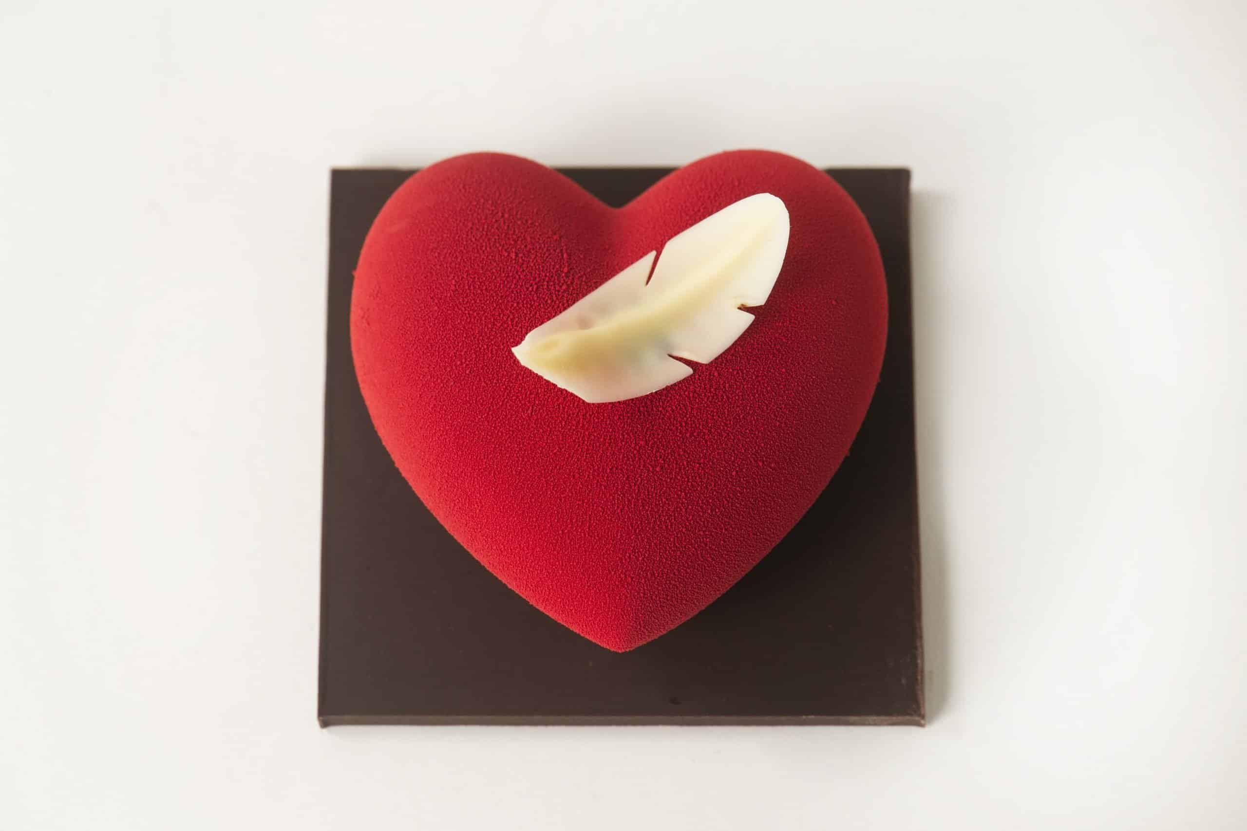 Dit fluweel hart met veer is volledig van chocolade en gevuld met kleine chocolade bolletjes.