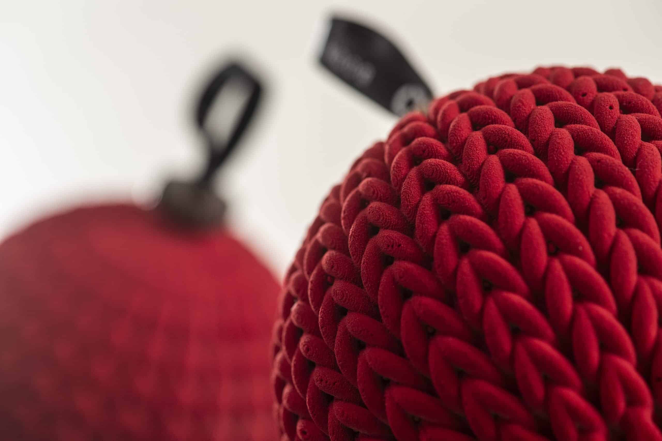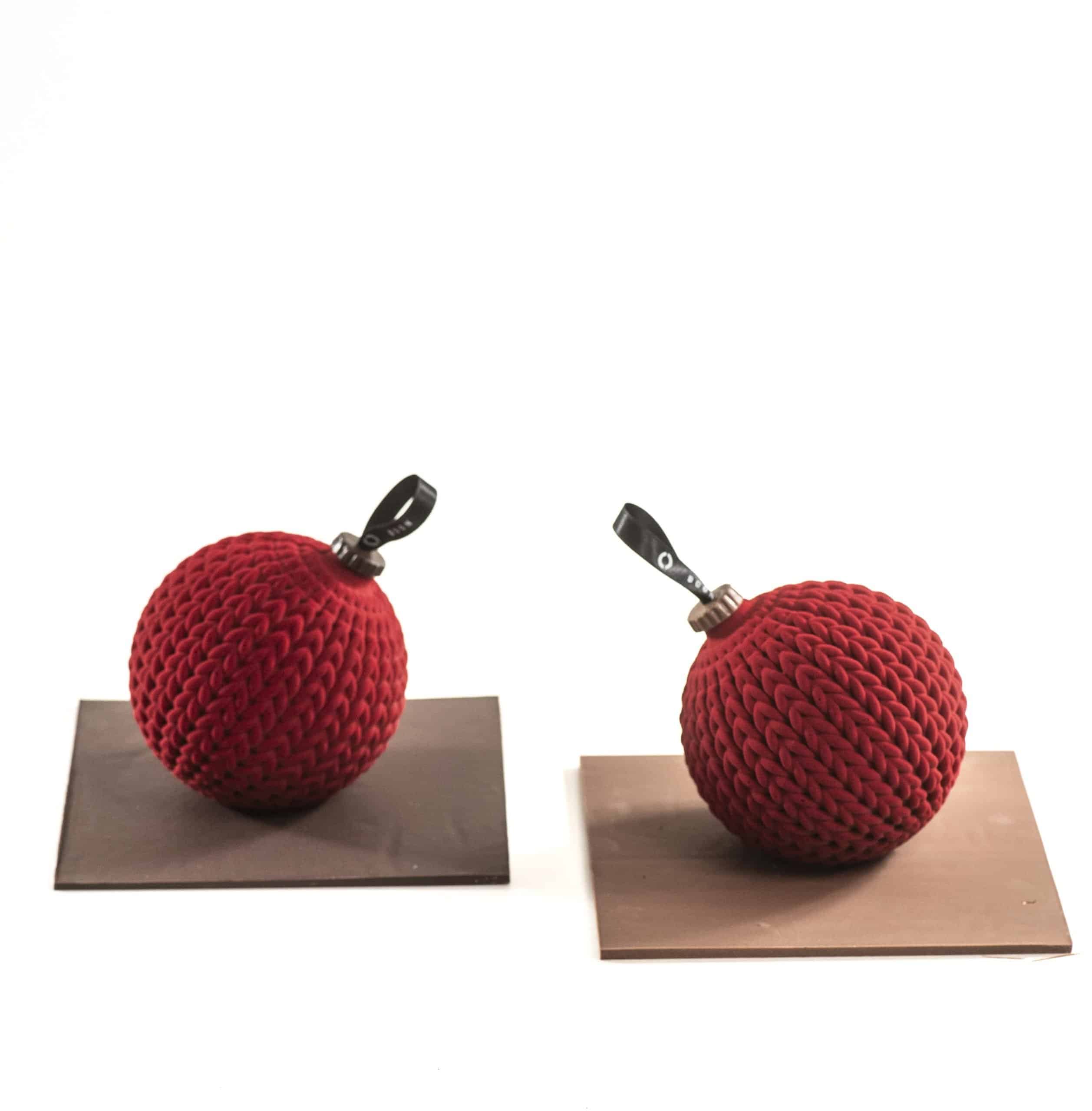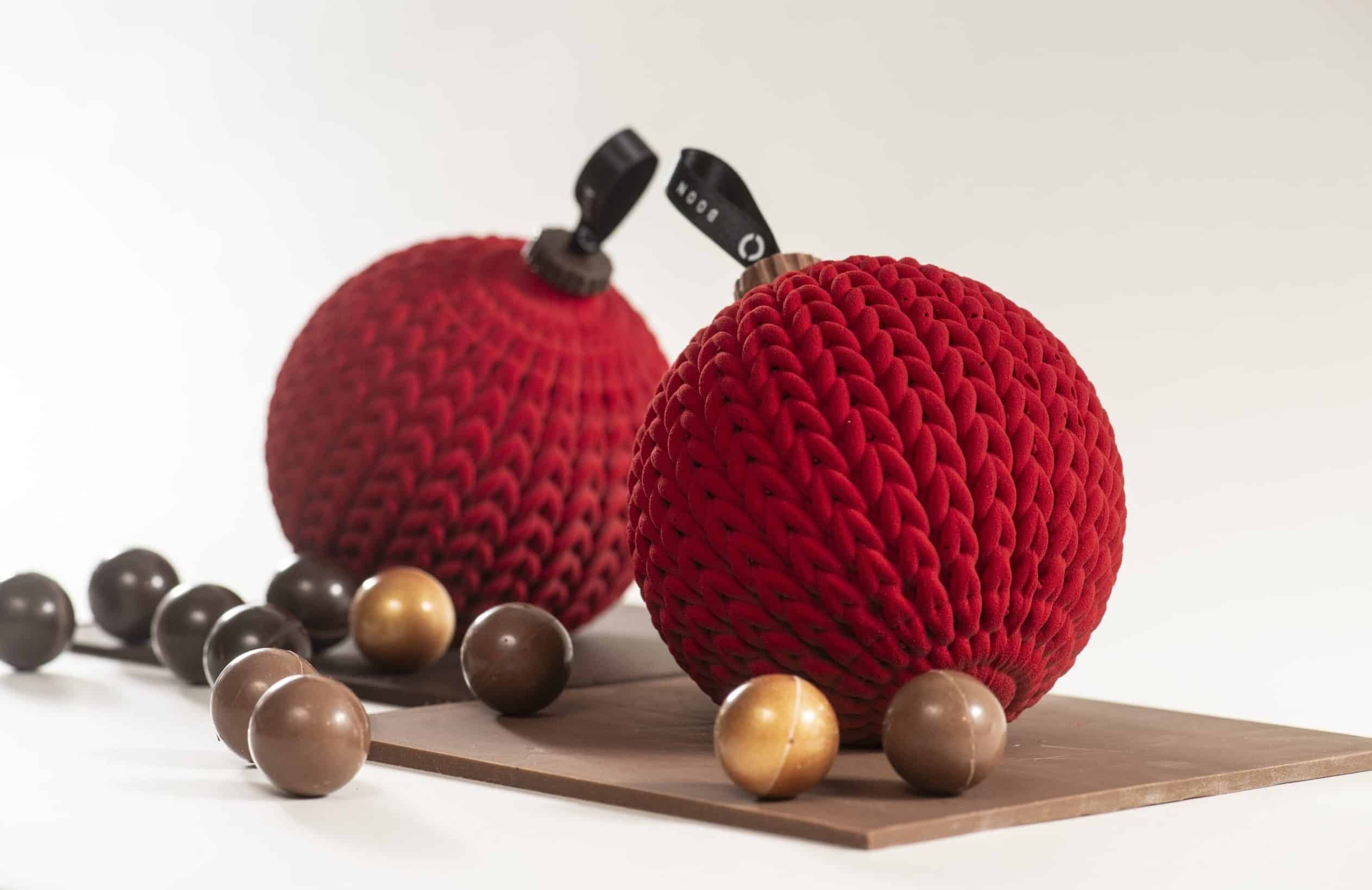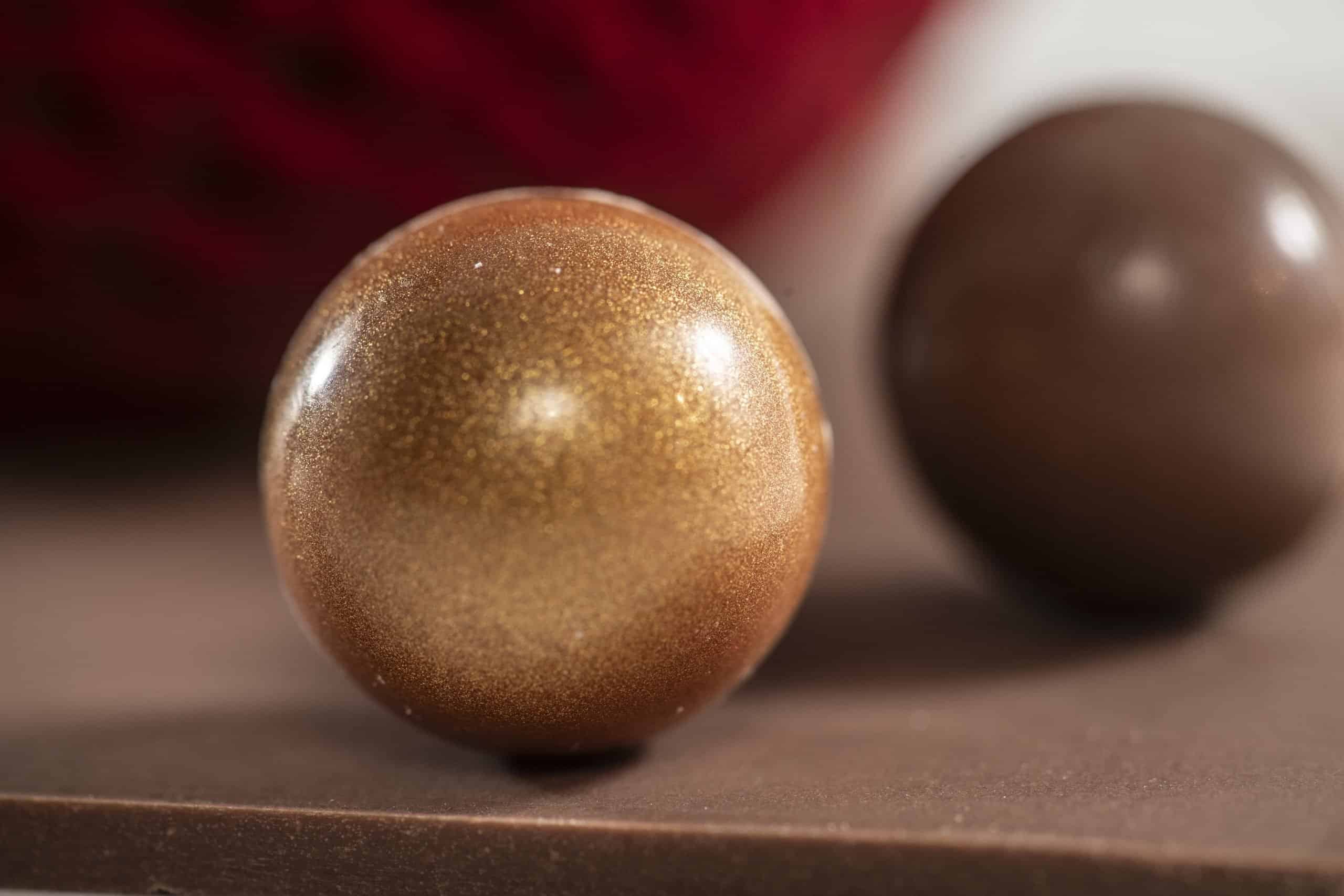Gebreide kerstbal, volledig van chocolade, gevuld met verschillende pralinébolletjes, waarvan telkens één een gouden afwerking heeft.
