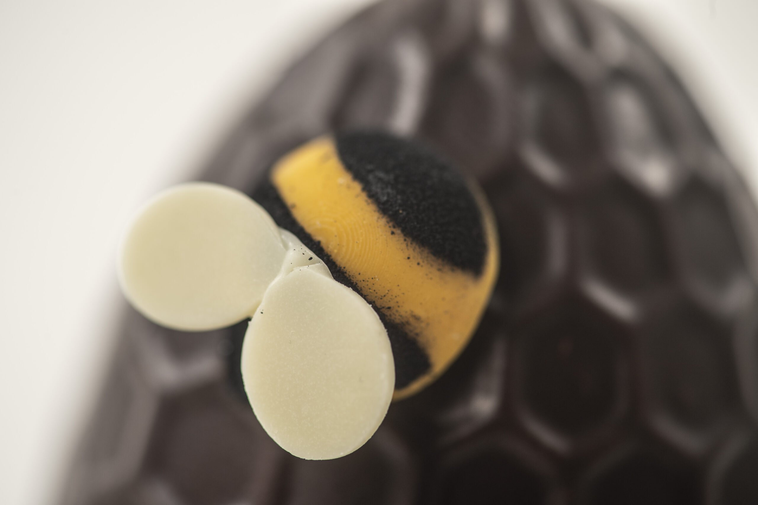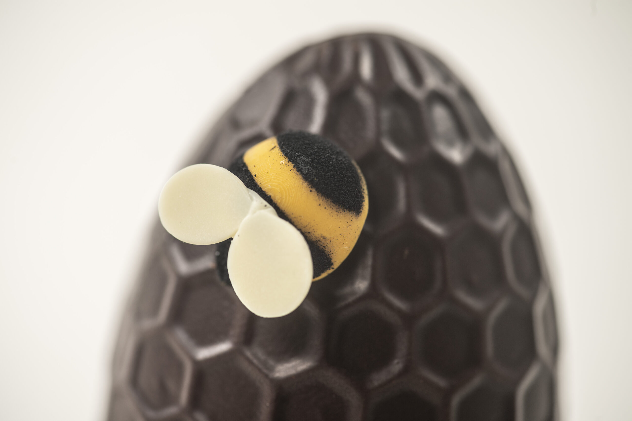 Gevuld chocolade-ei, afgewerkt met een bijtje en honingraat – volledig van chocolade.