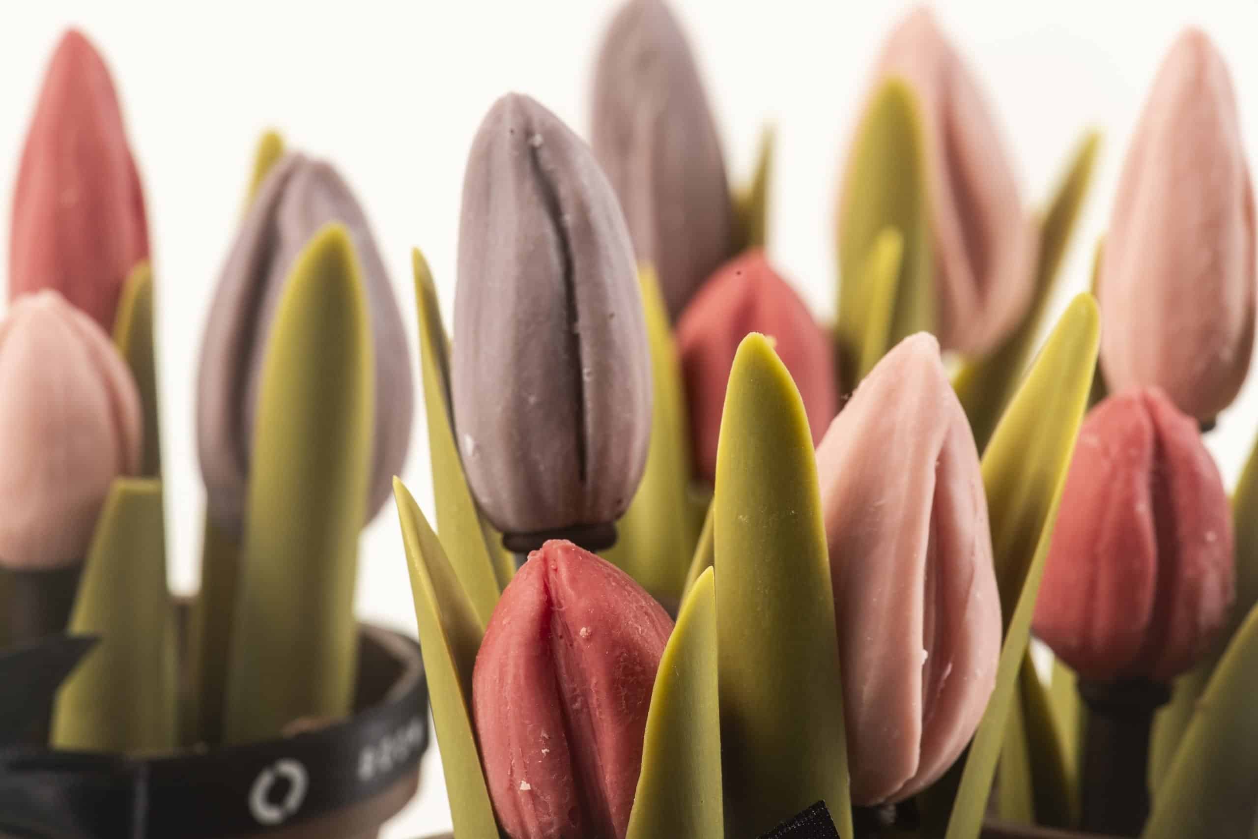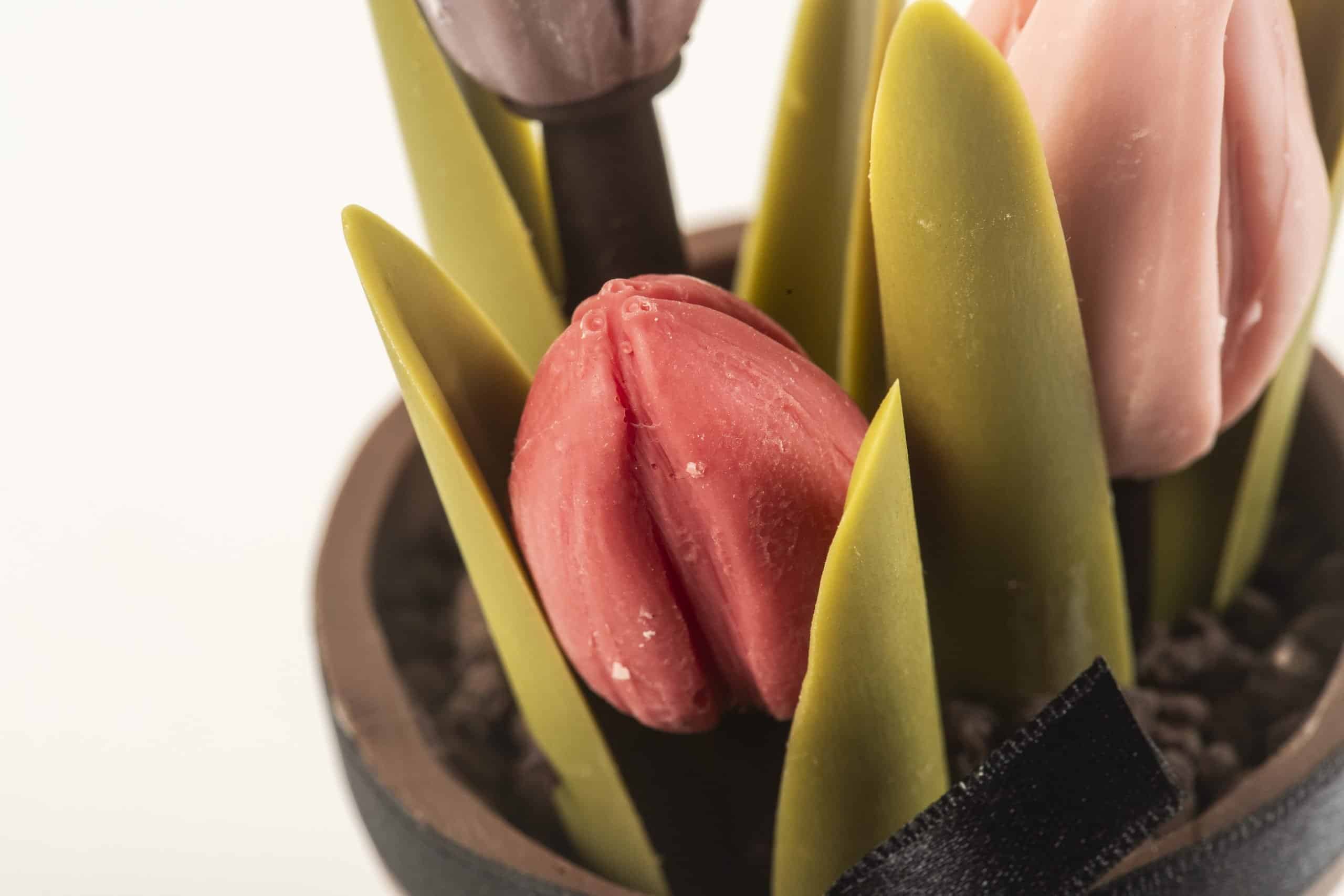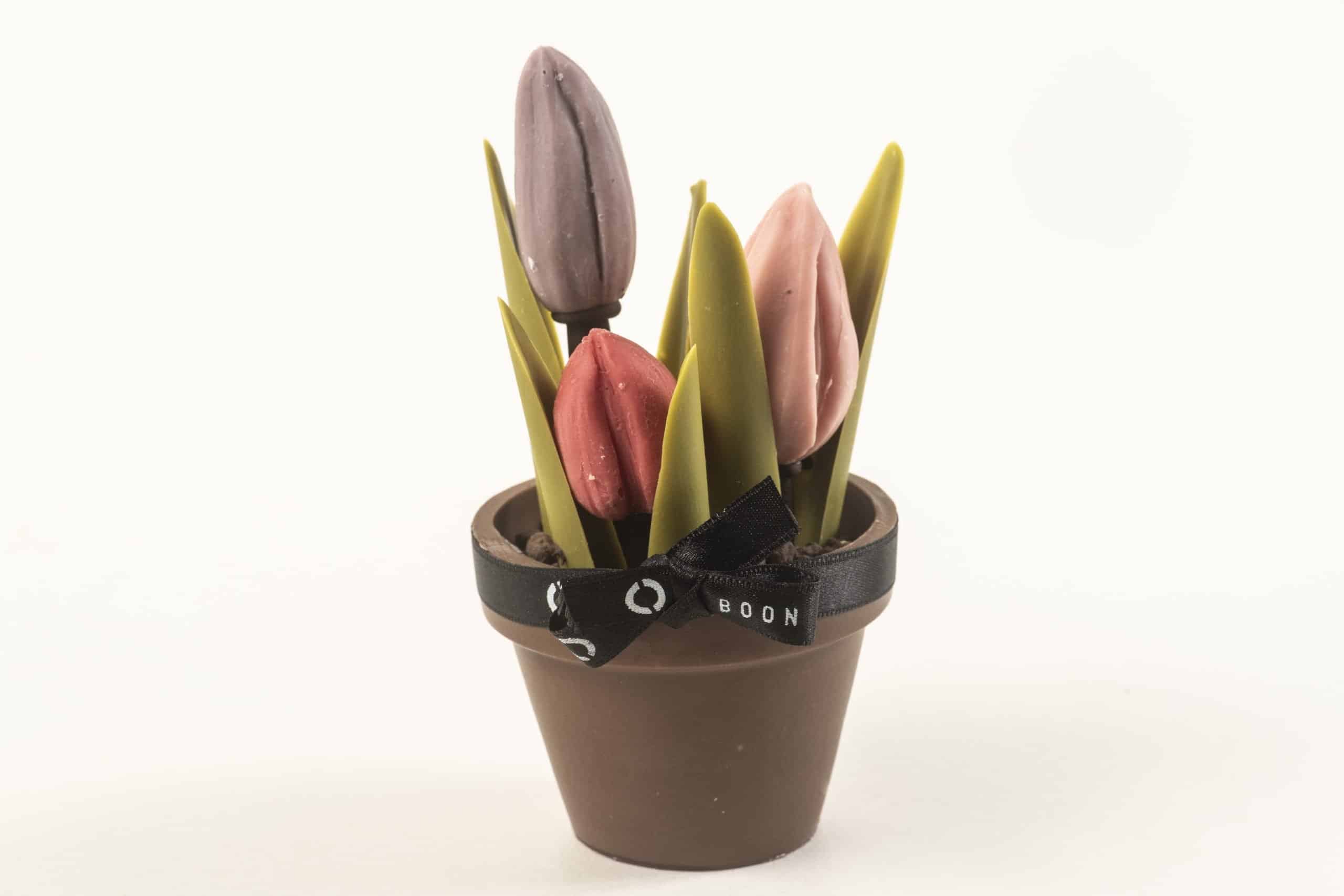 De bodemplaat is van donkere chocolade, de bloemen van witte chocolade, het potje is van melkchocolade met melkchocolade vulling.