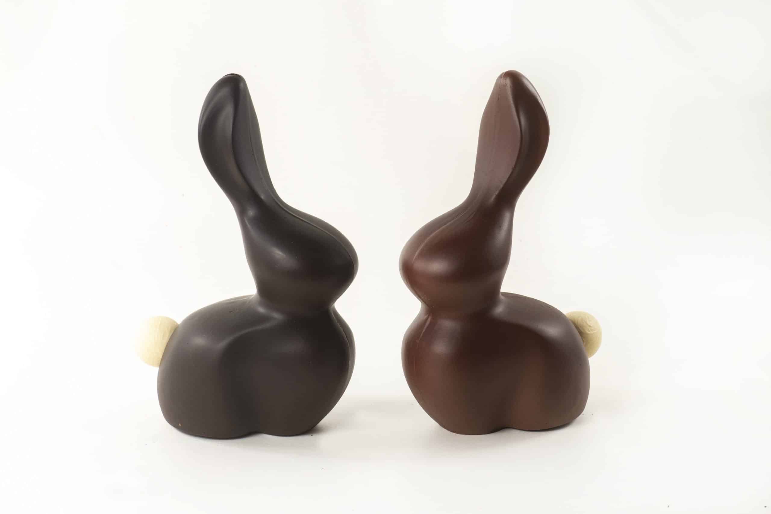 Deze grote holle paashaas is helemaal gemaakt van chocolade. Je kunt kiezen tussen melk- of pure chocolade. Ontworpen door Fabio Lorefice.